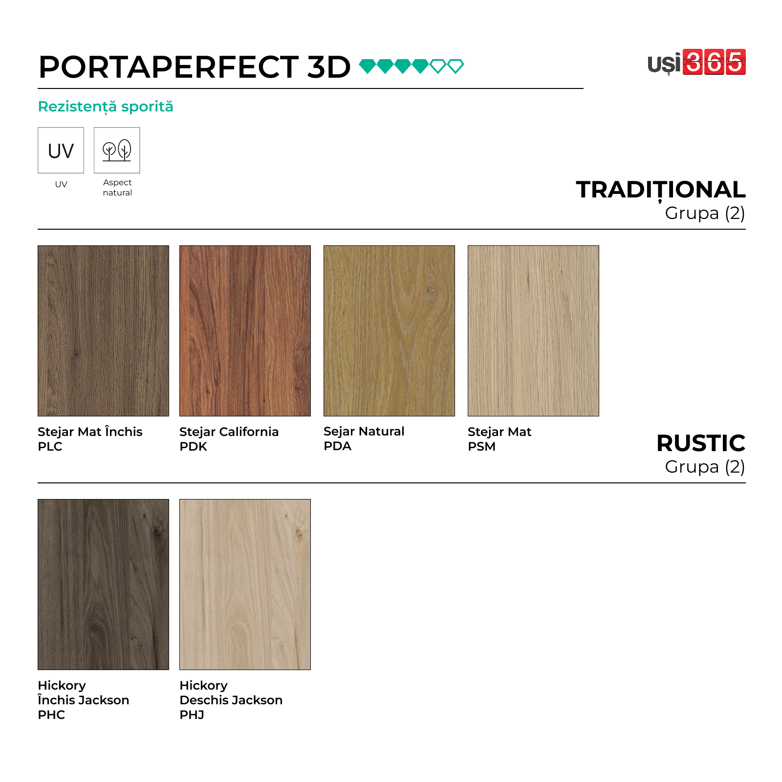PHJ Hikora Jackson Jasny; PHC Hikora Jackson Ciemny; PDA Stejar Natural; PSM Stejar Mat; PDK Stejar California; PLC Stejar Mat Închis; PER Stejar Natural Arles; PET Stejar Arles Toffee; PEK Stejar Deschis Salvador; PEE Stejar Alb Salvador