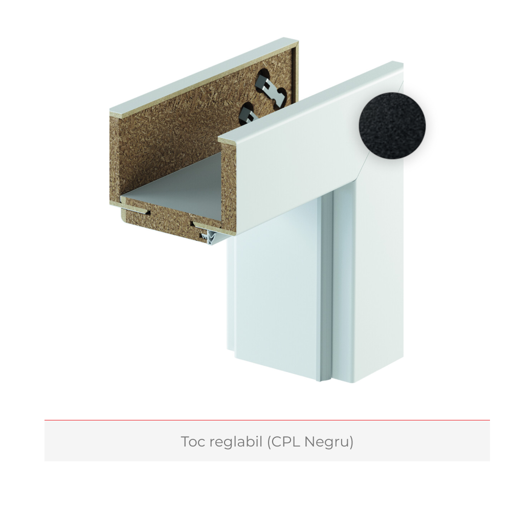 Tocul ușii este reglabil în intervalul impresionant de la 95 mm la 360 mm și este finisat cu o folie CPL rezistentă de culoare neagră, conferindu-i durabilitate și aspect elegant. De asemenea, aveți opțiunea de a alege accesorii de feronerie în culoarea neagră sau argintie, astfel încât usa să se potrivească perfect cu estetica dvs. personală.