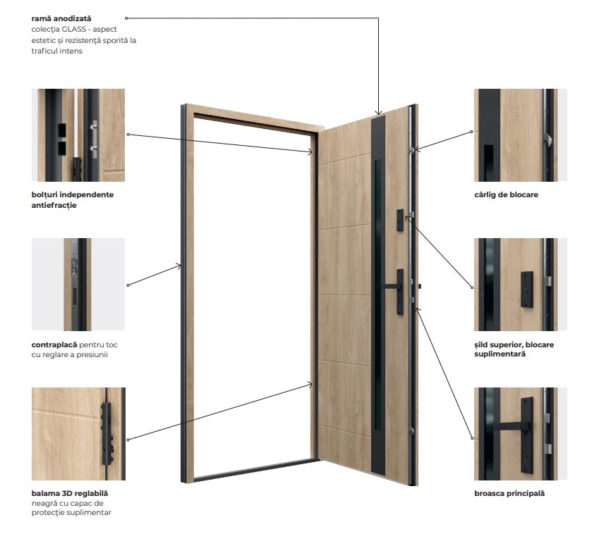 In versiunea configuratia Optimum Energy usa este echipata cu panouri termoizolante performante, care lasă lumina să intre, dar nu pierd căldura. Sticla este securizată, rezistentă și poate fi opacă, reflexivă sau tip oglindă. Holul tău primește lumină naturală, dar intimitatea rămâne protejată.