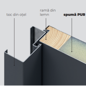 Exteriorul ușii este placat cu oțel laminat acoperit cu folie PVC, care imită perfect textura lemnului sau suprafețele moderne mate.Ușa își păstrează culoarea și aspectul impecabil chiar și după ani de expunere la soare, ploaie sau îngheț. Nu necesită revopsire, nu crapă și se curăță ușor. Este soluția elegantă pentru cei care vor o ușă frumoasă și durabilă fără întreținere complicată.