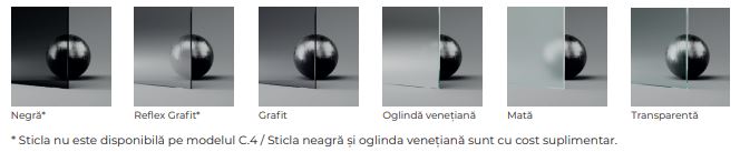- Opțiuni suplimentare: mecanism de autoînchidere, control acces SMART LOCK, panouri laterale și superioare cu sticlă termoizolantă