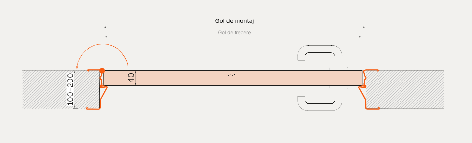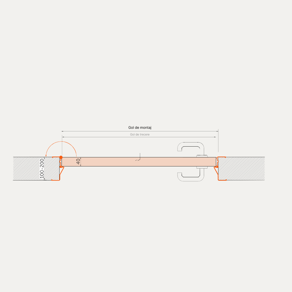 Tocul metalic este aplicat la fața peretelui, fiind executat din tablă de oțel galvanizat de 1.2 mm grosime, oferind rezistență excepțională și durabilitate pe termen lung. Această soluție tehnică permite realizarea efectului coplanar, cu ușa aliniată perfect la fața peretelui pentru un aspect elegant și minimalist.