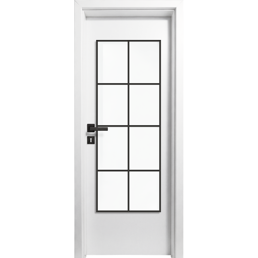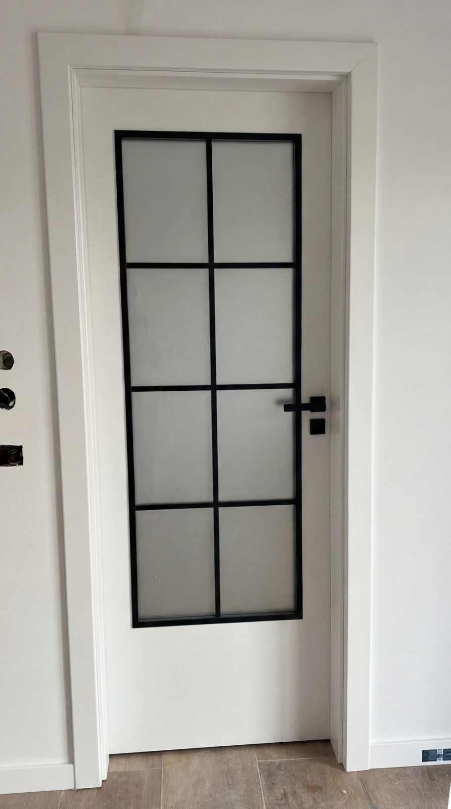 Designul este curat și modern, iar geamul mare (mat sau transparent) creează un efect vizual de deschidere. Baghetele negre nu sunt doar un accent grafic, ci dau o notă industrială recognoscibilă, foarte apreciată în amenajările actuale. Ușile se potrivesc în interioare cu inspirație scandinavă, modernă sau loft, completând perfect decoruri ce combină albul luminos, sticla și accentele metalice.